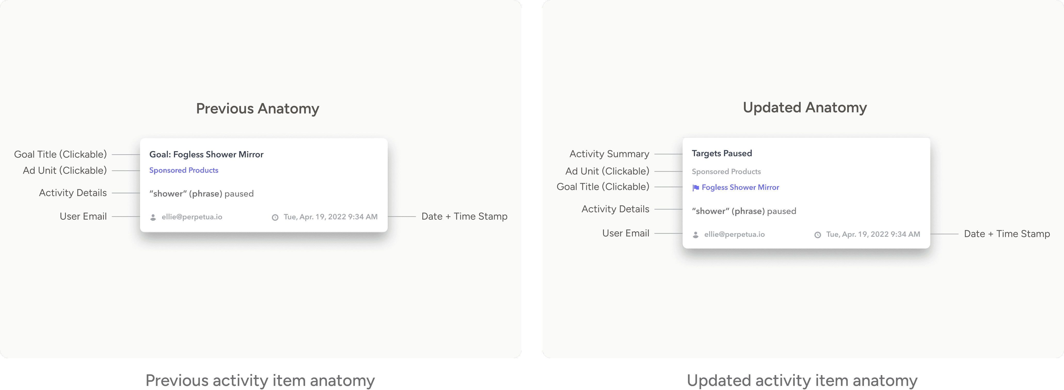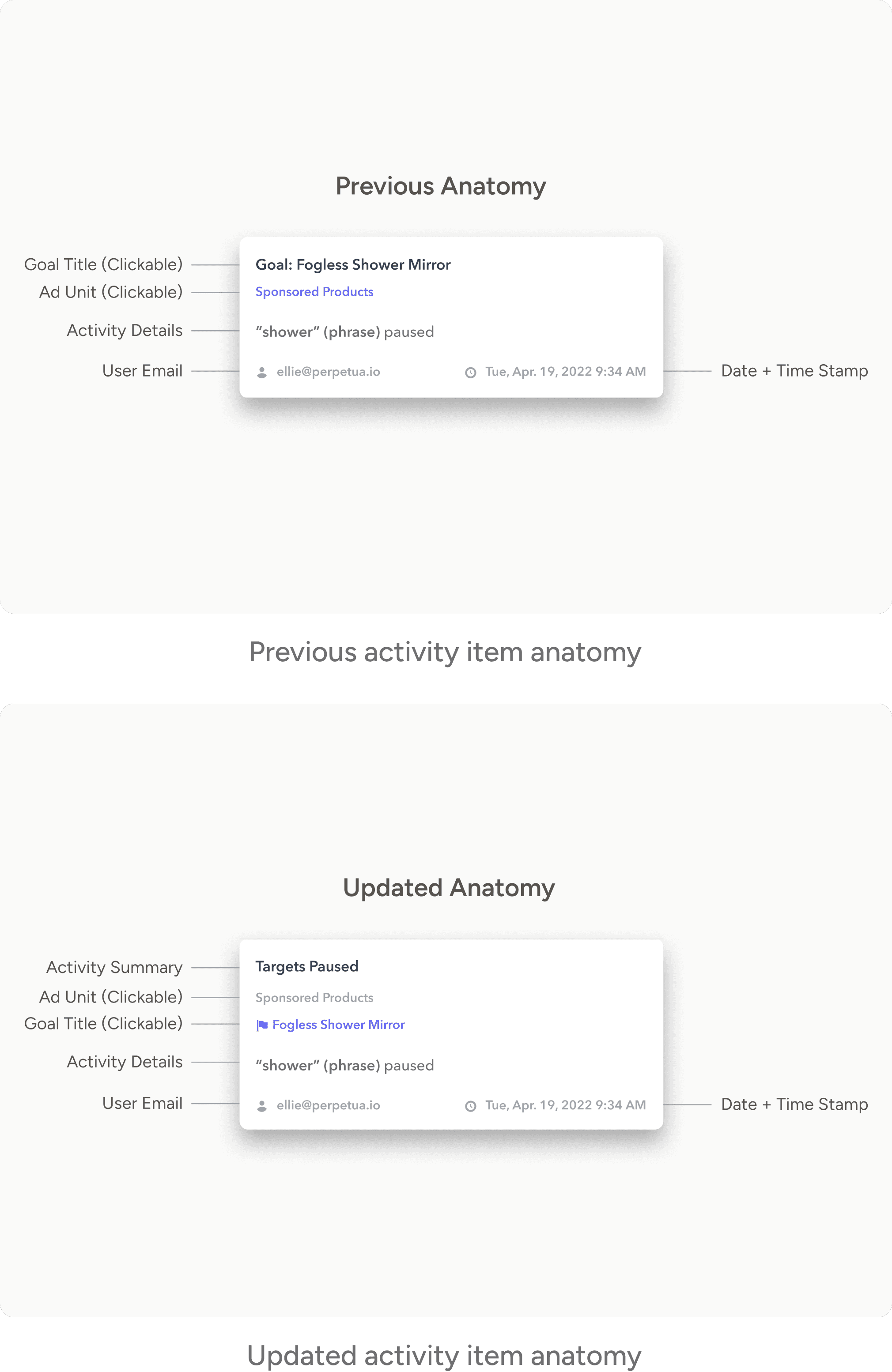 In the updated activity item anatomy, users can easily understand what each item relates to by reading a summary at the top.
