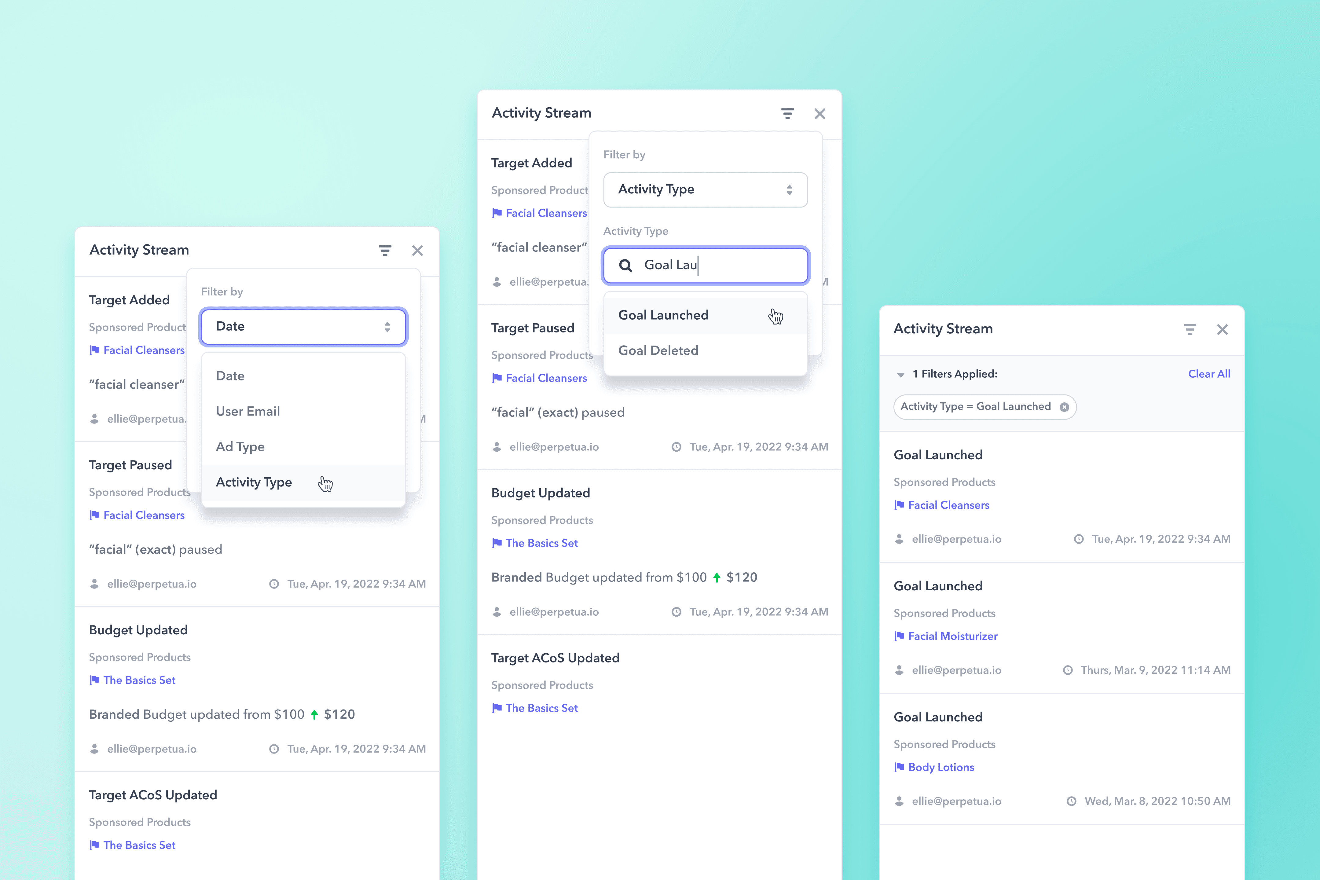 By automatically applying pre-set filters based on where the user has navigated to in the app, we reduce manual work needed to find the most relevant information. For example, when users click into a goal and open the activity stream, items are pre-filtered for the selected goal and ad type.
